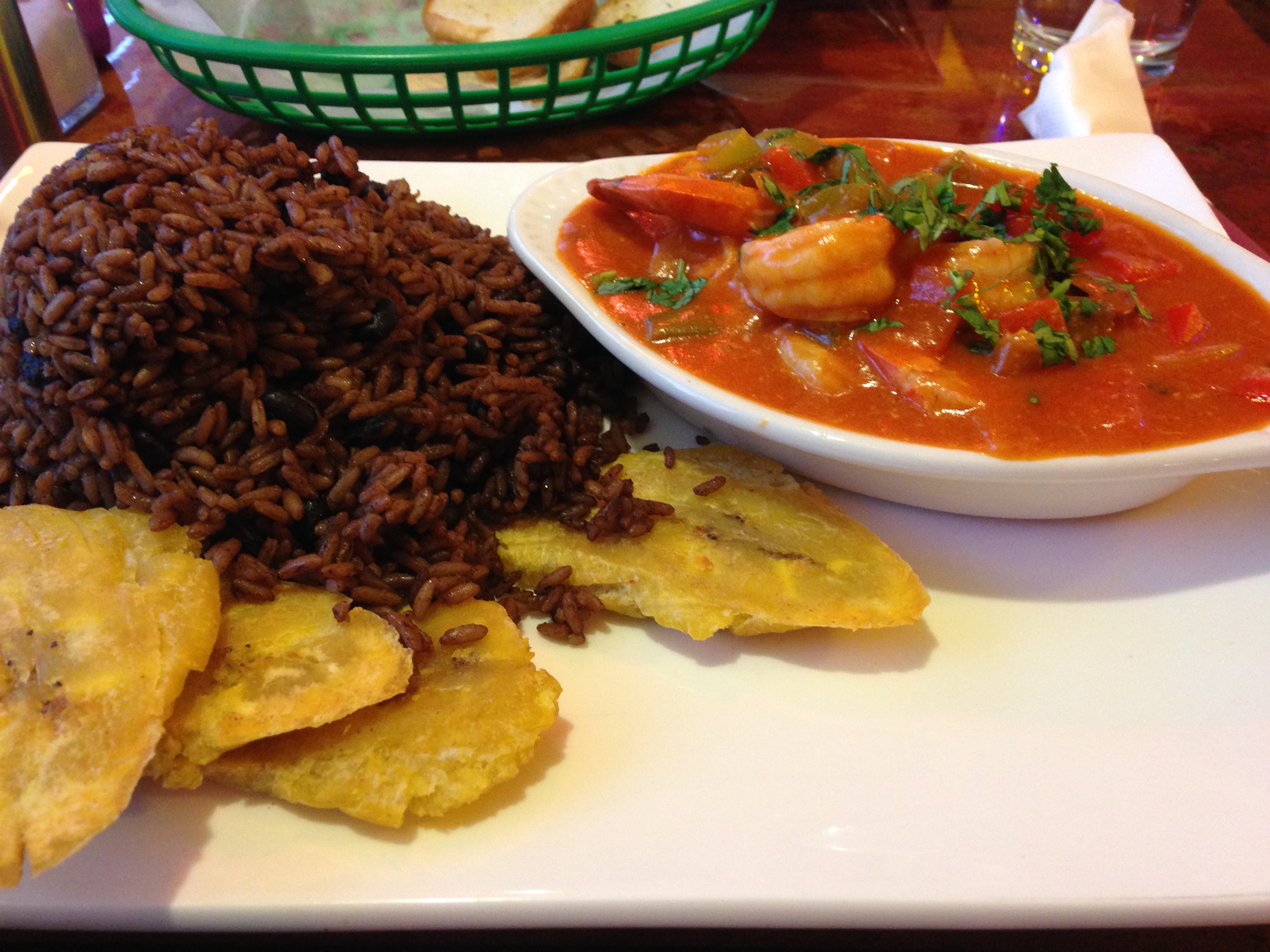 The food comes out. Upon a large plate sits a smaller oval dish that contains the shrimp and accompanying sauce. Also on the plate are some fried plantains and a heap of black beans and rice. The plate is delivered with a bowl over the beans and rice, which is then removed. I didn’t understand why at first, but almost immediately the hemispherical mound begins to collapse.